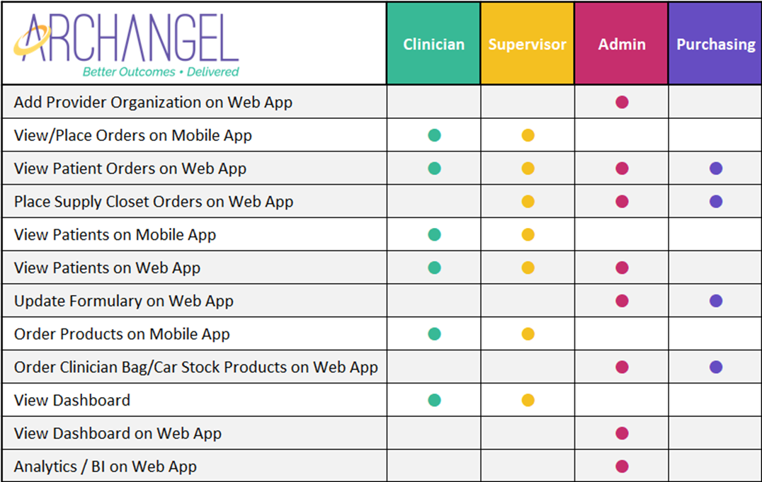 The chart shown below breaks down the 4 User Types that Archangel currently has and defines the roles as shown. Each account can only have one Admin, however, it is likely that there will be multiple clinicians or supervisors.